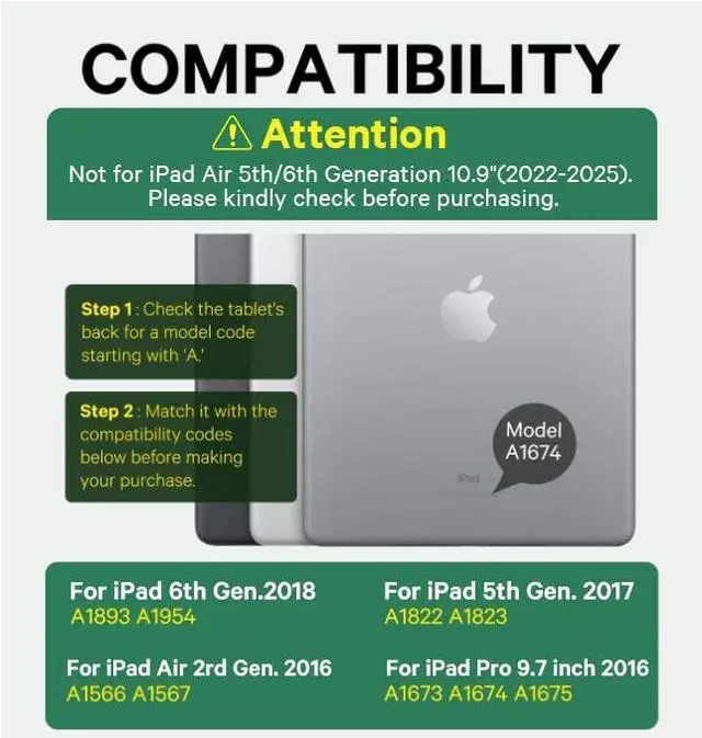Pro 9.7 (Model: A1673/A1674/A1675), iPad Air 2nd generation (A1566/A1567). Before ordering, please kindly check the back of your iPad to confirm the model number.