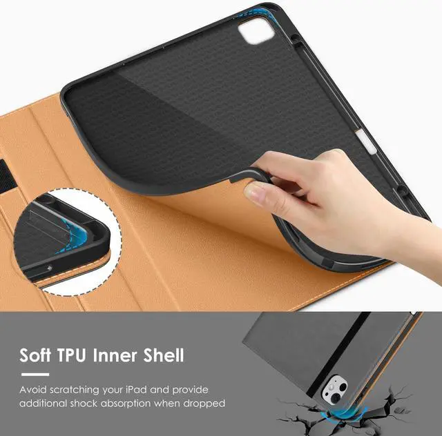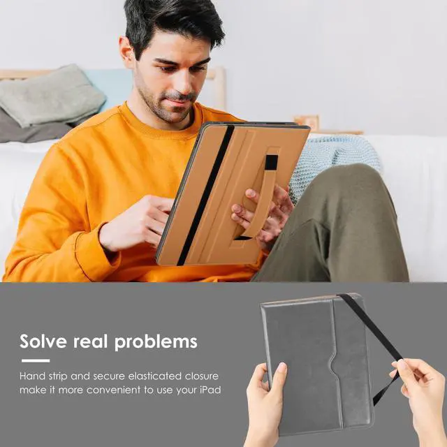 • [FASHION AND PROTECTION] - Offers the difference by full protection Design, leather back provides strong support, anti-fingerprint and anti-scratch. Soft TPU frame protects your iPad from shocks, drops and shocks. Hand strap helps you secure the front cover.