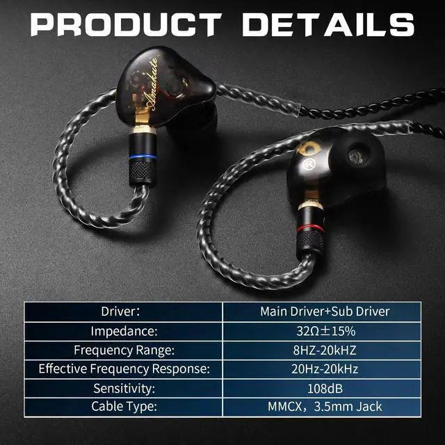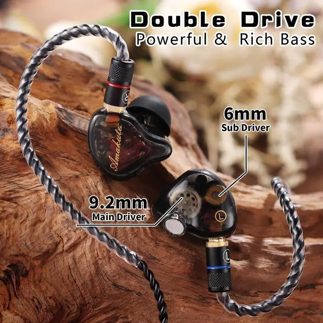 Professional-Grade Dual Drivers In Ear Monitor Experience studio-level sound with 9.2 mm dynamic + 6mm bass drivers that deliver balanced highs, mids, and lows - perfect for gaming, music production, and critical listening. As premium IEMs for gaming and in-ear monitors, these wired earbuds accurately reproduce spatial cues like footsteps in games while maintaining vocal/instrumental clarity. ^^ Ergonomic MMCX Design & Memory Wire for All-Day Comfort The detachable MMCX connector rotates 360 for anatomical fit, combined with form-fitting memory wire that keeps in-ear headphones securely positioned during intense activities. Engineered for stage performers and streamers using iem earphones 6+ hours daily.