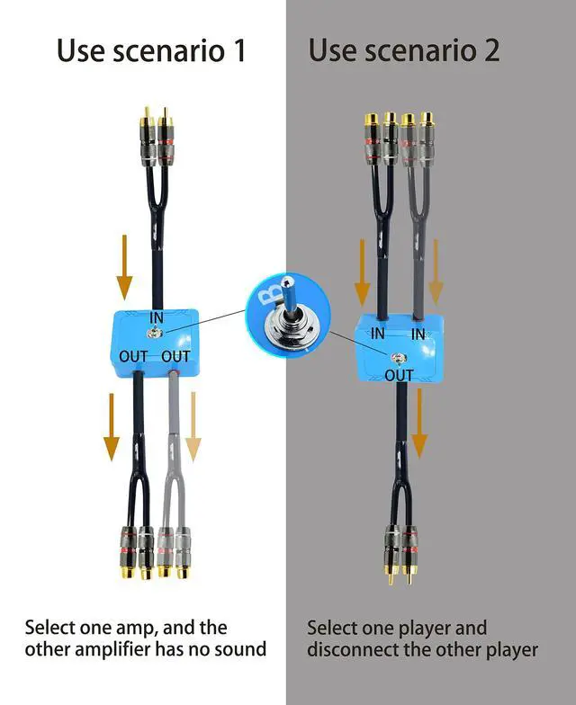 18ft Sound Channel swicher 2 male to 4 female RCA Switch Selector 2 in 1 Out R/L Stereo Audio 1 in 2 Out Stereo Audio Splitter with Mute Button No External Power Required CD Speaker dvd Player