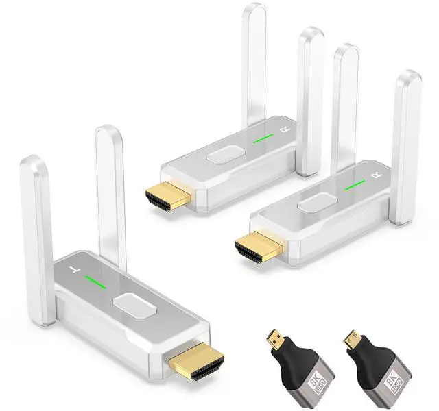 2.4G/5G Dual-Band + Dual AntennasThis wireless HDMI transmitter and receiver set uses 2.4G/5G dual-band transmission technology, paired with an optimized dual-antenna design, to provide strong and stable signal transmission that can easily penetrate walls and other obstacles. Using WiFi point-to-point direct connection technology, it achieves ultra-low latency, interference-free HD audio and