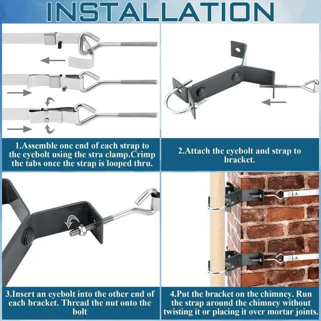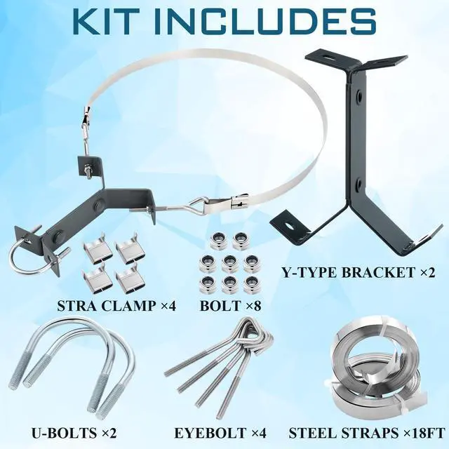 steelPackage includes: 2 x Y-Type brackets2 X 18 ft steel straps2 x U clamps4 x Eye bolts4 x Strap clamps8 x
