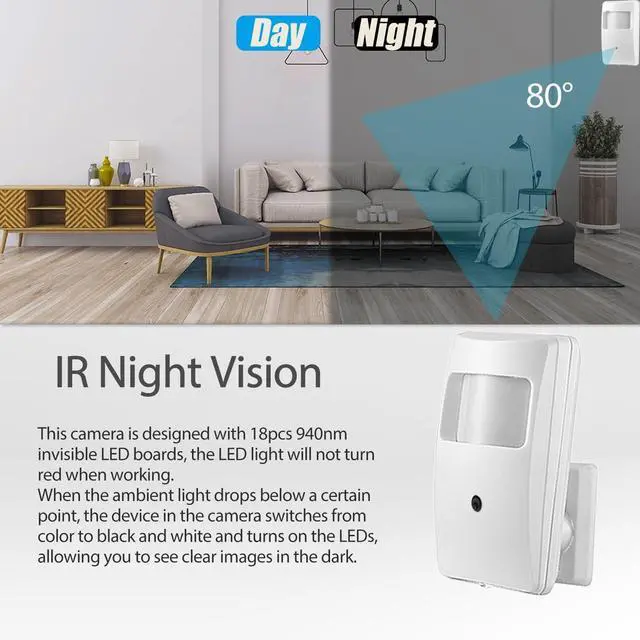 5MP (2880x1616P) Ultra HD Resolution This IP camera uses a high resolution 5.0 megapixel 1/3 inch CMOS sensor at 25 frames per second to produce clear and smooth images/videos, allowing you to see more details. ^^ 3.7 mm Lens / 940nm IR Invisible LED This PIR IP camera is equipped with a 3.7 mm lens. The viewing angle is about 80 degrees, which is concealed and safe. The LED with 940nm LED board is invisible to the naked eye. The LED light does not turn red when it is working. When the ambient light drops below a certain point, the device in the camera switches from color to black and white and turns on the LEDs, allowing you to see clear images even at night.