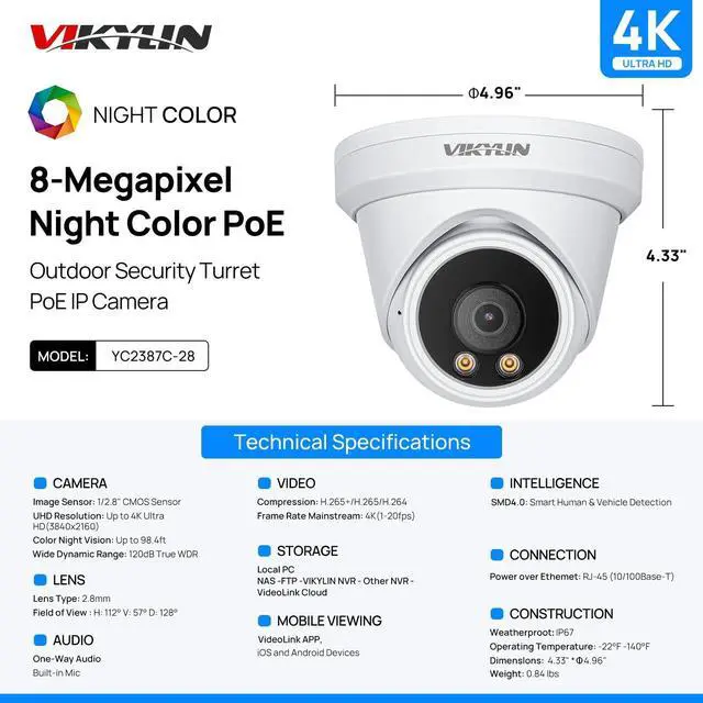 4k ip camera built-in mic (one-way audio), real-time capture of the sound around the camera, don't miss any details. ^^ High Efficiency Video Coding & PoE- This 8mp full color camera adopts the High Efficiency Video Coding standard, has efficient video encoding capacity, which saves bandwidth and storage space. 4K poe turret camera support Power Over Ethernet (POE camera) for easy installation (with Cat 5 & Cat 6 cable), only single Ethernet cable for power and data connection, plug in PoE injector/switch/NVR and the camera will be up and running, simplifies installation, and lowers cabling costs ^^ Unlimited Remote Access- To quickly and accurately respond to monitoring events, receive alert notifications through your smartphone with the free app (Remoteyes), Free PC software (VMS) or third-party software such as Blue Iris.