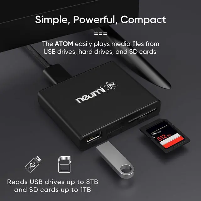 The NEUMI ATOM is the easy and affordable way to add video, photo, and music playback to any TV, new or old. Just attach a USB drive or SD card with your media files, select a file, and play! It is simple and intuitive to use with no complicated settings or controls. Turn on its automatic playback and resume capability and you wont even need to pick up the remote. HDMI Full-HD QualityThe ATOM offers stunning video quality through its HDMI output that supports up to 1080p/60Hz resolution, with support for the latest video formats such as H.
