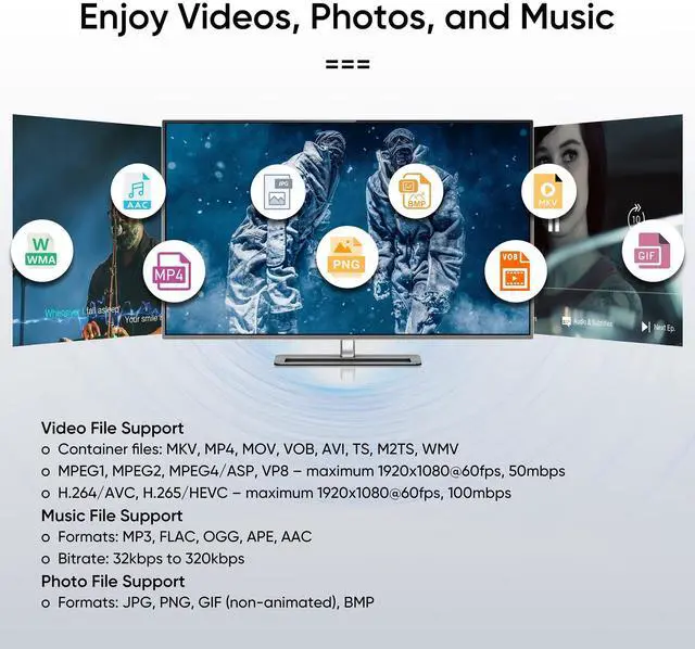 Media Format SupportVideo: MP4, MKV, AVI, TS/TP, MOV, VOB, and M2TS files using H. 265/HEVC, H. 264/AVC, VC1 or MPEG2/4 codecs, up to 1920x1080p@60fps resolution, 10-bit color, and