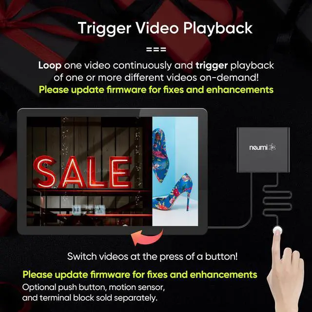 Popular file systems are supported, including FAT32, exFAT and NTFS. Automatic Playback and Trigger InputAutomatic playback feature allows the ATOM to find and play media files on power up without any user input. Ability to loop one video continuously and play a different video when triggered by an optional push-button or motion sensor. Build an interactive digital signage display, art gallery or museum on-demand video player, or a Halloween special effect in just a few steps. Push-button and motion sensors sold separately.