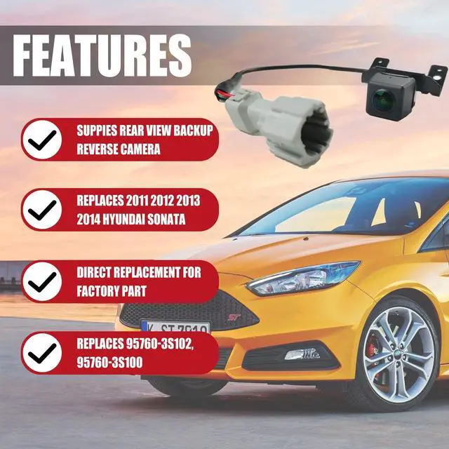 FeaturesThe backup camera plays an important role when the car is reversing. The automobile rear view back up assist camera is used to image presentation when reversing, which help to make sure a safe backdraught for you and people around you! Our carmera is stable characteristics, high reliability. ^^ Replace No. 95760-3S102, 957603S102, 95760-3S100, 957603S100, 95760-3S101, 957603S101. Please check the part numbers whether it suits your vehicle before purchasing. ^^ CompatibleThis Rear View Backup Camera fit for 2011 2012 2013 2014 Hyundai Sonata. And this camera is easy installation, just plug-and-play design, plugs into existing OE video harness, finish in 5 minutes.