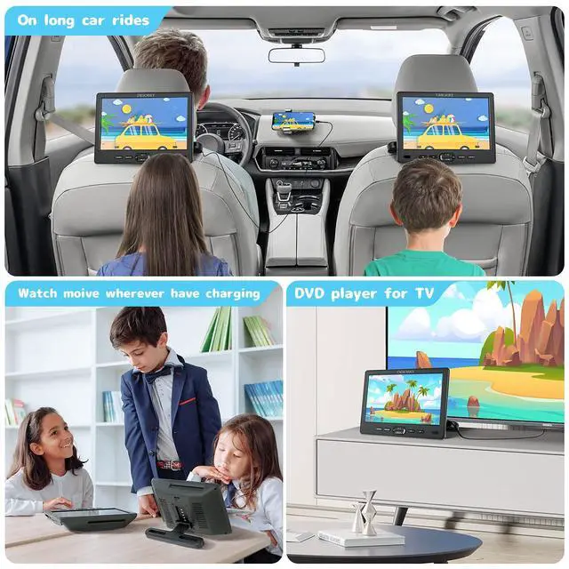 And can minimizes reflected glare to protect kids' eyes. Dual bottom speakers to bring double joys, clear and loud enough, and avoid sound interference to the front passengers. ^^ Magic Artifact for Kids & Easy InstallationThis car DVD player for kids create a happy and entertained space for backseat, makes kids enjoy themselves, eliminates children's anxiety and restlessness because of boring, so you can drive in peace comfortably and safely. Then, only use a screwdriver, you can easily detach it and move between vehicles. ^^ What You Get2*Car DVD Player, 2*Mounting Bracket, 2* Remote Control, 2* Headphone, 1*Car Charger, 1*AV Link Cable, 1*RCA Link Cable, 1*Screwdriver, 1*AC Adapter, 1*User Manual.
