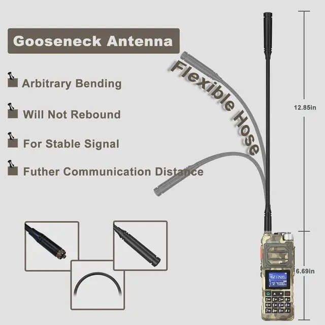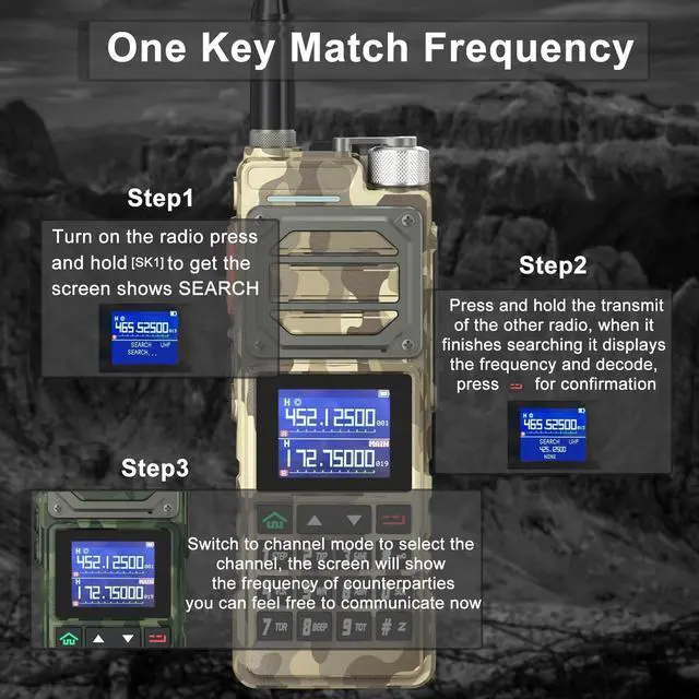 range: FM, AM, UHF, VHF Mutli-BandOne touch search frequency, easy pairing and grouping (copying channel configuration parameters) frequency step, selectable between 2.5K ^^ 5.0K ^^ 6.25K ^^ 10.0K ^^ 12.5K ^^ 20.0K ^^ 25.0K ^^ 50.0KF requency hopping to keep your call privacy confidential 1.77" TFT large screen, full keyboard, fully open menu operationChannel scan, frequency scan, and three scan and recovery methods: TO, CO, and SEUp to 999 memory channelsBroadcast FM radio receiver 65-108 MHzPower-on password management functionDual watch / Dual reception/ Dual-band handheld transceiverDTMF encoder and DTMF manual dialHigh Capacity Lithium-lon batteryVOX (voice activated transmit) Stopwatch functionAlarm functionDisplay illumination programmable via keypadHigh or low power selectableFunction beep on the keyboardProgrammable repeater offsetBattery save functionTen (10) levels of Squelch adjustmentTwo (2) pins for accessory portEnd of transmission tone, aka Roger Beep'Support NOAA weather reception functionTechnical