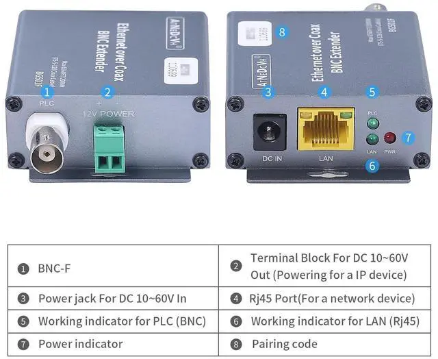 Interfaces: A RJ45 port, a BNC-F port, a DC 12V power jack (10-60V wide voltage input supported), a power supply terminal block (10-60V wide voltage to power IP devices supported, powering voltage=the DC power adapter input voltage).