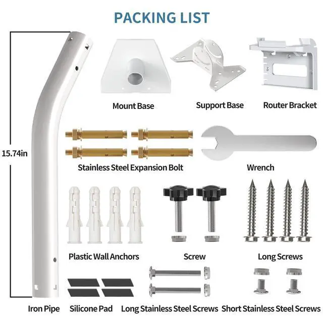 ^^ WHAT YOU GET: 1 x Metal Pipe, 1 x Mounting Base, 1 x Support Base, 1 x Router Mount, manual and installation accessories. If you have any questions, please feel free to contact us, we will answer you as soon as possible. ^^