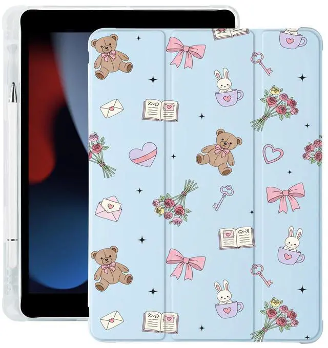 BlHMCASE Cute Kawaii Bear Bunny Bow for iPad Air 11 Inch Case 7th/6th Generation (M3/M2) 2025/2024 with Pencil Holder, Auto Sleep/Wake, Blue Leather Soft TPU Back Cover