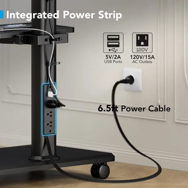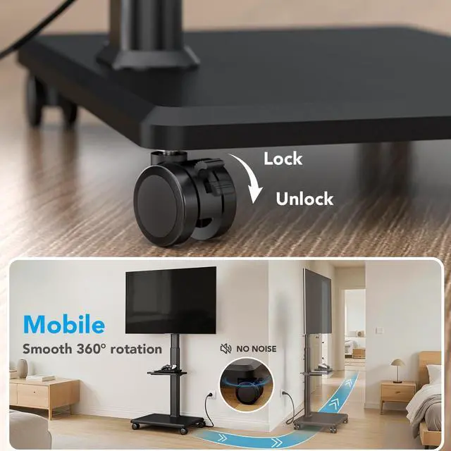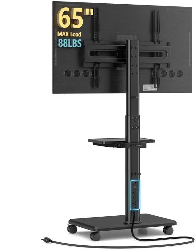 UNIVERSAL ROLLING TV STAND WITH WHEELS AX WABER rolling TV stand with Shelf fit most 27 29 30 32 37 39 40 43 47 50 55 60 65 inches LCD/LED/OLED Flat/Curved panel screen or monitor for Sony/Samsung/Sharp/TCL/ LG etc. FITUEYES rolling TV stand fits VESA 100x100mm to 400x400mm. Adapts to MAX 88lbs large TVs ^^ Mobile TV STAND WITH POWER OUTLETS This Mobile TV cart with Wheels features a built-in power outlet including 2 USB ports (5V/2A) and 3 AC outlets(120V/15A), and a 6.5 ft power cord. Cable management on the back of the mobile TV stand keeps your wires in place, stay away from entangled troubles ^^ HEIGHT ADJUSTABLE AND SWIVELABLE The universal mobile TV stand has multiple height adjustments above and below in order to choose your optimal space, and the TV can be swiveled left and right (35) to provide you with the most comfortable viewing angle ^^ MOVABLE STAND This rolling TV stand rolls smoothly, and the 4 wheels allow the stand to be moved to the desired position at will.