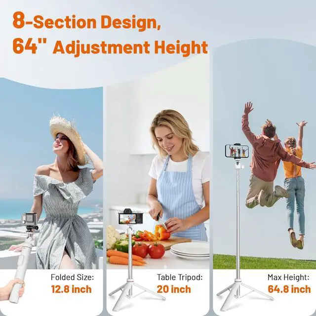 Wide Use: Extends up to 64", selfie stick 8-section extension poles, which can shoot at various heights and angles, providing you with a broader field of vision. Phone stand Fits all smartphones ( 2.2" -4"), compatible with iPhone 17 16 Pro Max, iPhone 15 14 /Mini and Android Samsung, etc. The1/4" screw mount compatible with camera Nikon Canon Fujifilm Sony RX Panasonic dslr camera, DJI Osmo Pocket3, Pocket2, insta360, and action camera...