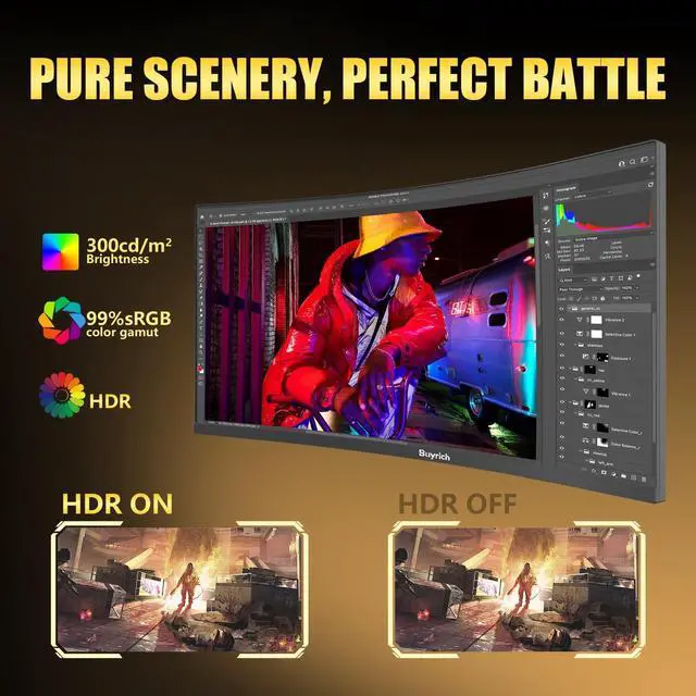 Professional-Grade Color Performance:34inch curved monitor 99 % sRGB wide color gamut + 4000:1 high contrast ratio, factory-calibrated to E < 2ready for design, editing and color grading out of the box. 300 cd/m typical brightness reveals deep blacks and brilliant highlights, preserving every minute detail.