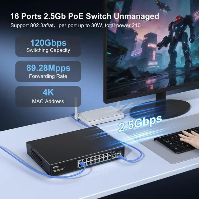 Ethernet+ Support: Ports 116 support IEEE 802.3 af/at PoE+ with up to 30W per port, total power 210W. Support IEEE 802.3 / 802.3 u/ 802.3 ab/ 802.3 bz/ 802.3 az/ 802.3 at/ 802.3 af, for powering IP cameras, VoIP phones, wireless APs, and other PoE-compatible devices without additional cabling. ^^ Plug & Play Switch Unmanaged Design: No configuration required. Supports auto-negotiation, auto-MDI/MDIX, and wire-speed forwarding on all ports. Perfect for small businesses, surveillance systems, and home networks. ^^