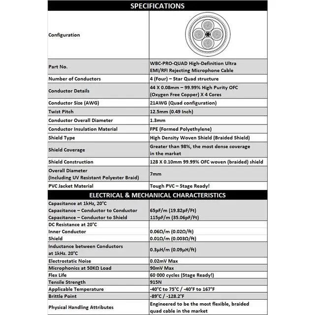 • WBC-PRO-QUAD is truly the Most-Silent & the Most-Flexible Star-Quad cable in the market & boasts a tough UV-protected outer jacket, a dense braided shield (above 98% coverage) & four, 0.08mm Fine-Stranded 99.99% Oxygen Free Copper cores totaling to 21AWG. Excellent shielding coupled with the Star Quad design totally cancels out all EMI & RFI, this stage-ready cable will encounter, resulting in the purest form of signal transmission. Superior to Industry leaders like Mogami 2534 & Canare L-4E6S.