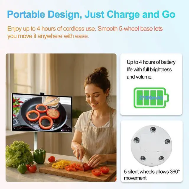 Power Outlet: With a built-in 27, 000 mAh rechargeable battery, fully charging takes 4 hours only, this smart screen keeps working even when unplugged. Roll it anywhere in your home or office without rearranging furniture or hunting for socketsideal for shared spaces, temporary setups and everyday flexibility. ^^ Adjusts to You, Not the