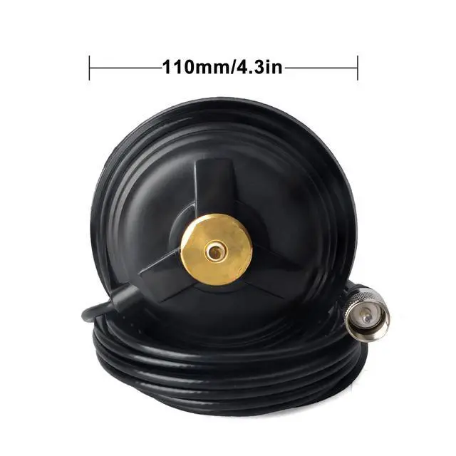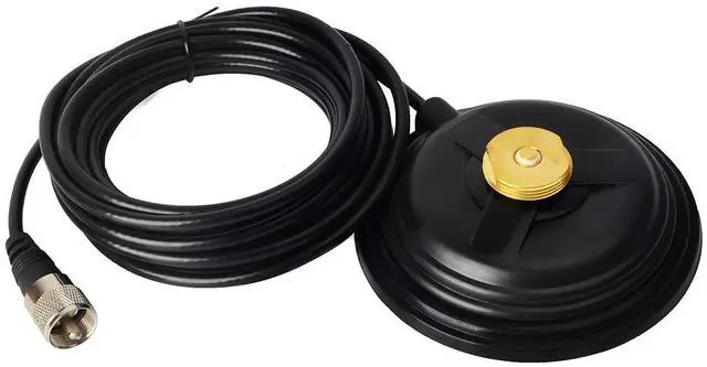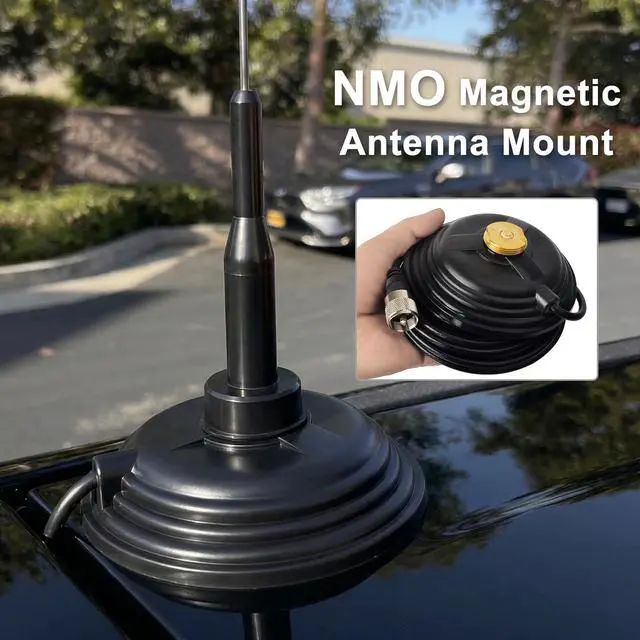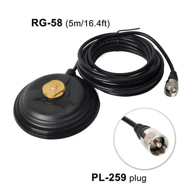 - NMO Mount Magnetic antenna Base with a base diameter of 110mm/ 4.3 inch and a strong suction of 14KG (about 30.8 lb), providing a secure and stable connection. ^^ - Suitable for all NMO antennas, allowing you to easily connect and install your preferred mobile radio antenna. ^^ - 5M ( 16.4 ft) RG58 Coaxial Cable with a PL-259 (UHF male) plug, designed for mobile radios with a UHF female connector. Adapters can be used to make it compatible with other radios. ^^ - The magnetic base is made with soft rubber, ensuring a safe and durable hold while also preventing scratches on your vehicle's surface.