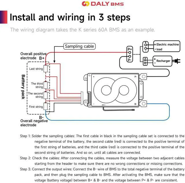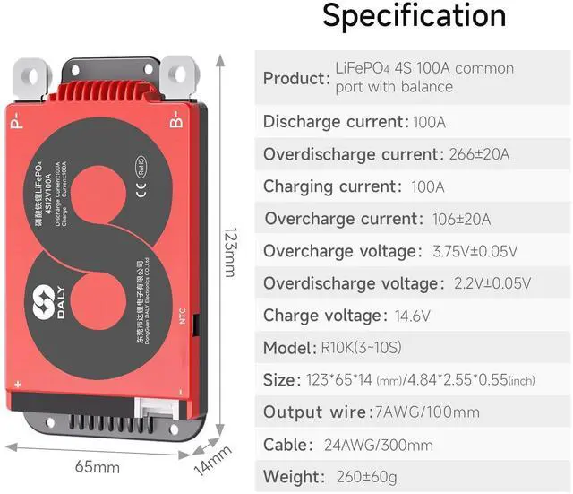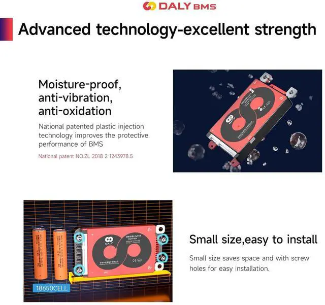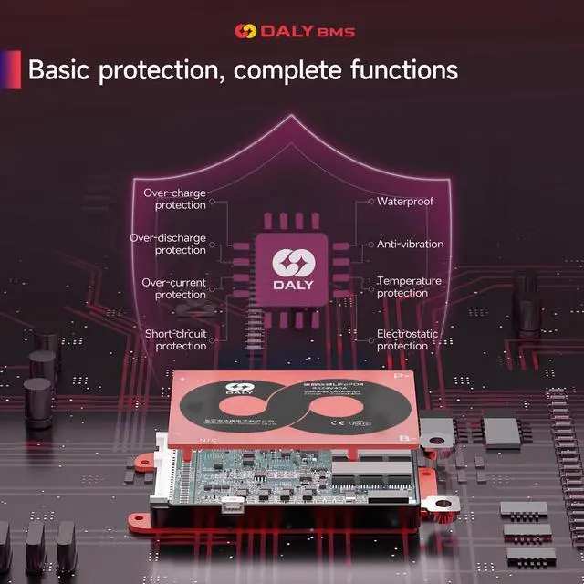 DALY BMSAdopt injection molding sealing process, with dustproof, shockproof, waterproof, anti-accumulation function ^^ Multi -Function ProtectionOver-charging, Over-discharging, Over-current, Temperature and Short-circuit protection functions. --- ISO/ FCC/ RoHS/ PSE/ CE APPROVED ^^ New UpgradeSmaller size; Pre-charging function; 100mA Passive balancing current; Low temperature rise; Consistent Chg/Dischg cuurrent. ^^ Easy to installEasy to plug and unplug, which allows you to effortlessly create an electrical connection between the battery pack and the BMS. ^^ NoteStandard BMS dosen't have communication functions. If you need smart BMS, active balancer, parallel module or other accessories, please contact online customer service.