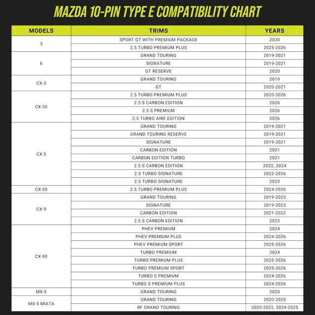 ^^ EXTENDED COMPATIBILITY: In some cases (for example, in some of the CX series) you may have two available ports one exposed port as well as a shrouded mirror covering another port. In this instance we recommend using installing our 10-Pin Type A into the exposed port for a faster and easier installation (although you can choose to install the 10-Pin Type E under the shroud for a more OEM looking result).