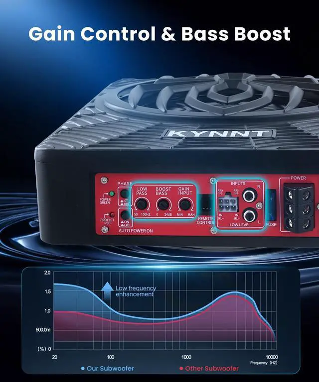 Powerful Bass ExperienceEquipped with an efficient built-in digital amplifier, the KYNNT powered car subwoofer delivers a peak power of 1200W. Combined with a 35mm ASV voice coil and an enhanced magnetic circuit system, it provides deep, responsive low-frequency performance. The aluminum alloy shell ensures both heat dissipation and structural durability for stable long-term operation, elevating your rock music journey with immersive, pulse-pounding bass ^^ High/Low Level ConverterFeaturing a high/low level converter, this subwoofer supports selectable high/low-level inputs, adjustable bass boost from 0-18dB, tunable low-pass filtering from 50-150Hz, and a 0/180 phase switch.