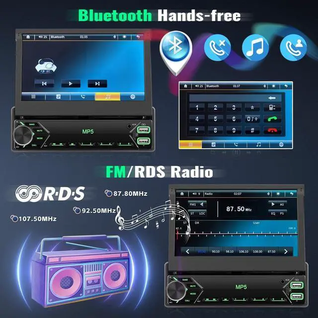 Single Din Flip Out IPS Touchscreen: This single din flip out car stereo features flip out touchscreen, IPS HD 1024x600 screen resolution, smooth touching experience and ensure the high-quality viewing experience of picture or video from different viewing angle. The retractable car radio with 4*45W power output and connect to subwoofer/amplifer, support video output.