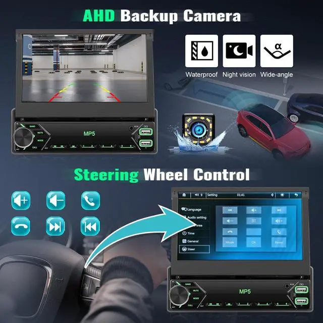 Steering Wheel Control: The flip out bluetooth car stereo with a backup camra, single din head unit will automatically switch to clear reversing image when you put the rear gear in the car. Parking can be safer and more convenient. Support steering wheel control to quickly switch the radio volume, songs, and phone calls ^^ AUX/2 USB & Type-C Fast
