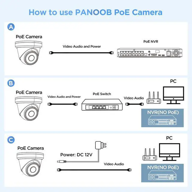 ^^ PoE: Our PoE camera built-in standard 802.3 af PoE, compatible with all standard PoE NVR, PoE switch and PoE injector, no additional power adaptor required. One network cable transfer power, video, audio and data. ^^ Work with Panoob