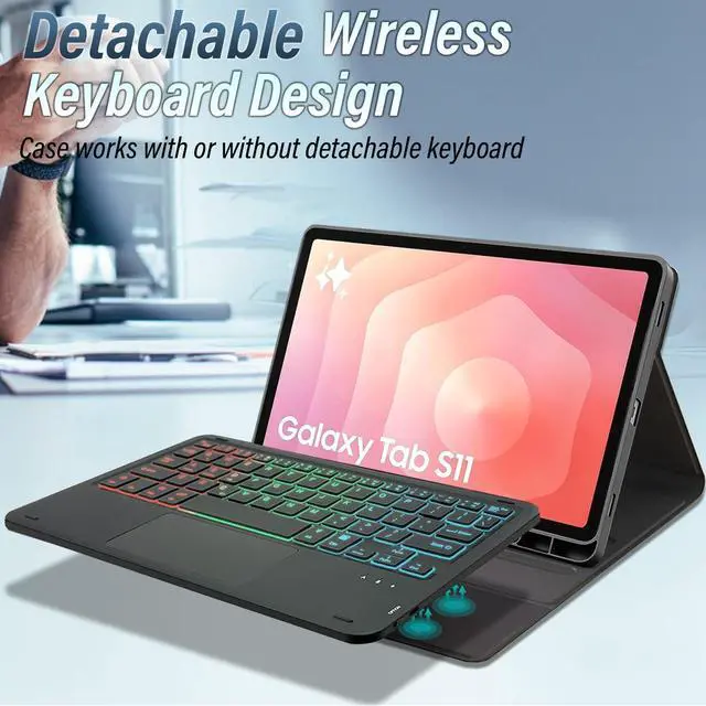 Compatibility ModelTouchpad Wireless Keyboard Case Exclusively designed for Samsung Galaxy Tab S11 5G 11 inch (Model SM-X730/X736B) 2025 Release tablet, NOT compatible with any other Galaxy models, please check your tablet model before buying. ^^ 3-Zone 7 Color BacklitBacklit Detachable Keyboard makes your keyboard gorgeous and special, typing fun and easy in the dark/night. Built-in long life Lithium-ion battery and high quality waterproof keyboard conductive film, Adjustable backlight allows you to personalize your setup, match specific working conditions and showcase your favorite colors. Make it easier to find your keys in the dark.