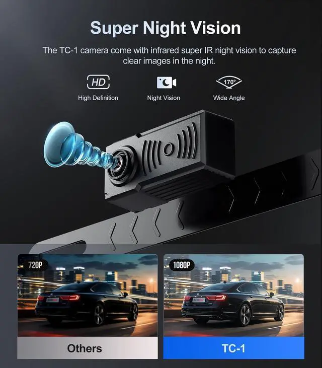^^ Plug and Play, Easy InstallationThis reverse camera is easy to install, powered by car charger port, plug it in to display the back up image, if you don't need to display it all the time, you can press the switch to turn off the screen display. you can also connect the red wire to the reverse light power supply only when you are backing up and automatically trigger the reverse image only when you are backing up. ^^ Excellent Night VisionTC-1 vehicle backup camera with night vision, the camera LED light will automatically light up at night, which can continuously provide high-definition images in low-light environments to ensure the safety of driving at night.