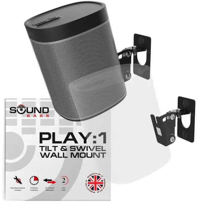 SONOS PLAY: 1 speaker. ^^ INGENIOUS DESIGN - The wall mount's design is simple yet cleverly thought out. The mounts are slim and almost invisible once the speaker is mounted to the wall. The Play 1 speaker can be mounted in either orientation with a wall clearance of 57mm. The mount provides a swivel of +42 to -42 (left to right) and a tilt of +3 up and -35 down. ^^ DESIGNED IN ENGLAND - Created by SOUNDBASS, a team of dedicated mechanical and acoustic engineers, to ensure you get the best possible audio performance from your new