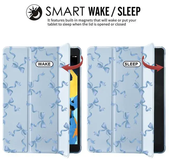 Protection: This lovely bows design case for ipad is made of two materials. The comfortable and soft silicone and high-quality durable TPU material provide a comfortable touch for the pad. The back of this blue bowknot case for ipad is made of soft TPU, which provides full body protection and is more durable than traditional silicone materials. It is less prone to yellowing, prevents scratches, and maximizes the protection of your pad from damage and scratchesAuto Wake/sleepBuilt-in magnetic strip, our blue bowknot case for ipad can automatically wakes or puts your tablet to sleep when the lid is opened and closed, protecting and extending battery life; precise cutout also completely supports newest touch ID key function. Built in pen holder ensures the safety of your pencil. Adjustable angleThe trifold stand shell design of this lovely bows design case forapple ipad can easily change the angle to meet your viewing and typing needs. This modern aesthetic women case for ipad can be folded into a stable triangle, firmly supporting your pad. Whether it's work, study, or watching movies, they can meet your needsPerfect