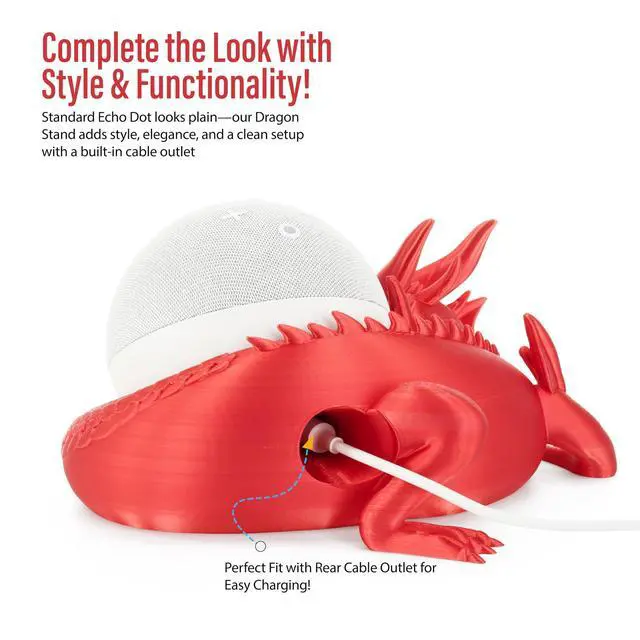Introducing the Costume Wizard Dragon Stand, a meticulously crafted 3D printed dragon designed to elegantly hold your Echo Dot 4th/5th Gen smart speaker. Made in the USA, our dragon stands are not just about aesthetics; they support American workers by utilizing high-quality materials and expert craftsmanship. Whether you are a dragon enthusiast or looking to add a touch of mythical charm to your home or office, this desktop speaker stand is the perfect choice. Our dragon stand transforms your echo devices into a centerpiece, adding an enchanting element to your decor.