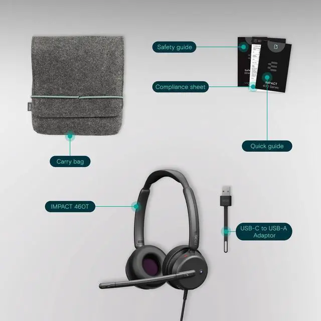 The EPOS IMPACT 460T is a Microsoft Teams Certified stereo USB headset designed for hybrid workers. Featuring dual-mic noise filtering, it ensures premium voice pickup for open office environments. Enjoy rich, clear sound through professional-grade speakers and stay comfortable all day with soft dual ear pads and a padded headband. The headset includes a dedicated Teams button, lift-to-mute functionality, LED mic mute indicator, and is compatible with EPOS Connect & Manager.