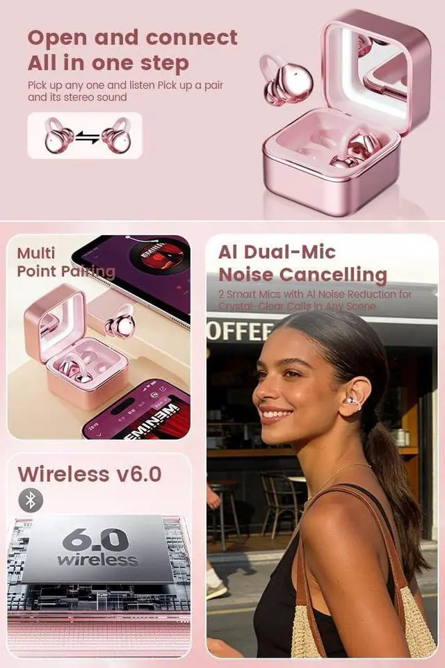 Comfort & Awareness: Gentle, secure clip-on fit rests around (not in) your earszero pressure or fatigue, even after hours. Open-ear design keeps you aware of surroundings (traffic, coworkers) while enjoying audioideal for work, walks, or home relaxation. ^^ Bluetooth 6.0 +
