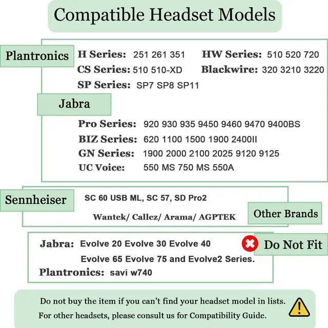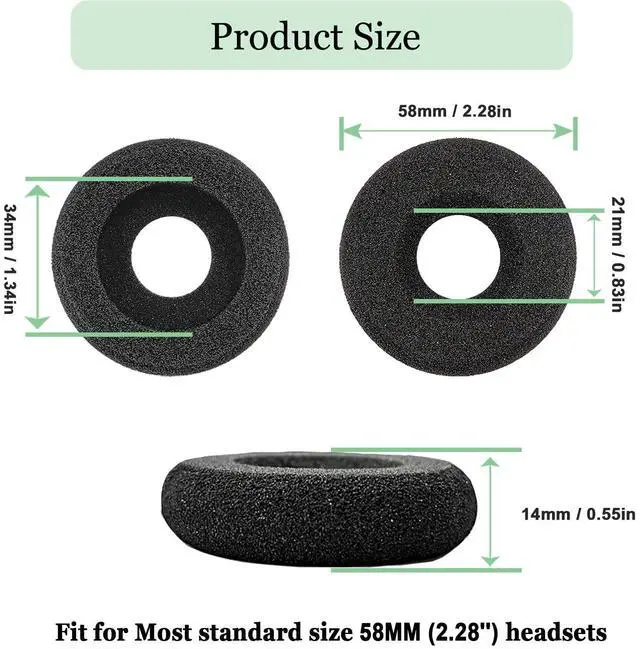 Doughnut Size DesignThese 58mm/ 2.28 inches ear cushions replacement ONLY fit some special brand from Jabra Plantronics VXi Blue Parrott B250-XTS Callez Arama AGPTEK MAIRDI VoiceJoy Office Headsets and Most Standard Size Headphones perfectly with the same specification. For compatibility list in details, please refer to the description below. ^^ Perfect Fit Headset ModelsNOT for Jabra Evolve 20 30 40 65 75 and Evolve2 Series. ONLY COMPATIBLE WITH SOME SPECIFIC HEADSETS MODELS LISTED IN DESCRIPTION. Some specific models from Plantronics HW251N HW261N HW510 HW520 Blackwire C225 C310 C320 3210 3220 3310 3320 3315 3325 and Jabra PRO 920 930 9450 9460 9465 9470 BIZ 620 1100 1500 1900 2400II GN 1900 2000 2100 2025 9120 9125 and ALL Callez headsets, etc.