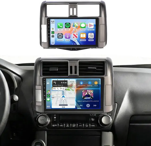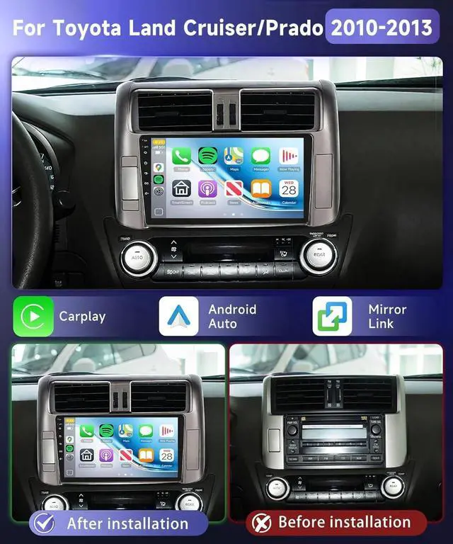 For Toyota Land Cruiser Car Radio The Chip 4G+64G Android Car stereo fits for Toyota Land Cruiser/Prado 2010 2011 2012 2013 Radio. Upgraded RK-3326S Chip 4G Ram and 64G Rom ensure run smoothly, Package contains frame accessories and installation tools. Before purshasing, please check your car models/years/shape of center console. If you have any question, please tell us via ^^ Wireless CarPlay & Android Auto This 5.0 bluetooth radio supports wireless CarPlay and Android Auto via Bluetooth, enabling seamless access to apps like Waze, Spotify, and Sirius-XM Radio directly on the touchscreen ^^ 32EQ & RDS/FM Radio Hi-Fi audio enhance car audio with rich, live-like sound and customizable settings.