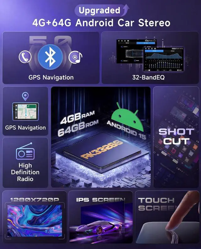 32-band EQ for personalized audio settings. The RDS/FM radio receives signals for music, news, and traffic updates ^^ 5.0 Bluetooth & External Mic Equipped with a 5.0 Bluetooth radio and upgraded chip for faster pairing, stable connectivity, and precise positioning. Enjoy hands-free calls and music streaming, enhanced by the included external mic for crystal-clear audio ^^ 1280x720P Touchscreen & 2.5D Tempered Glass The for Land Cruiser car stereo features a 1280x720P HD touchscreen with scratch-resistant 2.5D tempered glass, delivering vibrant colors and durability for an immersive visual experience ^^ Online+Offline GPS & WiFi Double din radio build-in GPS chip support Offline GPS navigation Ensure your orientation.