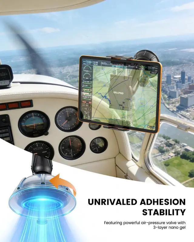 ^^ MULTI-SCENARIO: FROM AIRCRAFT TO VEHICLES Beyond aviation, this versatile heavy-duty mount excels in everyday travel. Use the robust suction cup on your car windshield, semi-truck window, or boat helm. We also include a free adhesive disc, allowing for secure installation on textured car dashboards, RV consoles, or any flat surface for seamless hands-free navigation. ^^ 80MM TWIST-LOCK FOR GLASS WINDSHIELDS Engineered with a massive 80mm vacuum suction cup, this aviation mount delivers 30% more grip than standard car mounts. The mechanical twist-lock system secures firmly to smooth glass surfaces, ensuring your device stays attached through altitude pressure changes, engine vibrations, and extreme cabin temperatures. ^^ 25MM BALL HEADS FOR MAXIMUM STABILITY Designed to combat heavy turbulence and off-road vibrations, the 95mm adjustable arm utilizes an upgraded dual 25mm ball joint system. This industrial-grade hardware prevents your navigation display from drifting or loosening, providing a rock-solid viewing experience for both commercial drivers and private pilots. ^^ UNIVERSAL FIT FOR 5-13" DEVICES & THICK CASES The reinforced clamp features a deep 0.78 -inch jaw depth, perfectly accommodating thick aviation cases, rugged covers, and accessories.