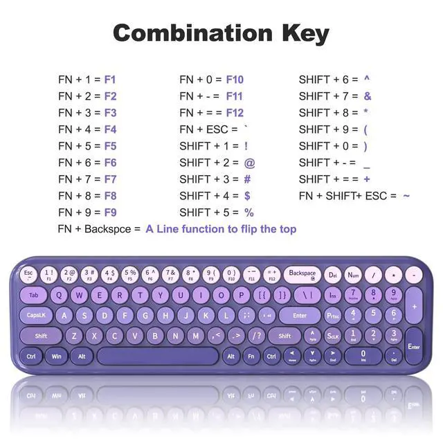 Purple-Gradient Wireless Keyboard and Mouse Combomost popular color of 2025, to attract more people's eyes, give you a different vision, enjoy a different keyboard experience, create a colorful desk, and be a pleasant mood for you! ^^ Floating Button DesignAll buttons adopt a floating circular button design, and are also equipped with a brush to clean the garbage on the keyboard. The floating button design gives you a soft and quiet feeling, and takes you back to the most original type of Typewriter Style! ^^ Wireless 2.4G Techplug and play, 35 feet working range, 2-in-1 nano receiver, no need to install other software, no delays or Drop the line, Make your desk surface more neat and tidy, Keyboard or mouse can be used separately, just insert a single USB Receiver to use your Typewriter Wireless Keyboard Mouse Combo! ^^ Automatic Power Saving FunctionmodeIf you don't use the keyboard for more than a minute, the keyboard will auto-enter the sleep mode to save power, which greatly prolongs the battery life, Click any key or button to wake up within 2 seconds, If one day the keyboard suddenly does not work, please replace the battery and try to use it, when the battery is dying, the low battery indicator on the typewriter keyboard will remind you to replace the battery.