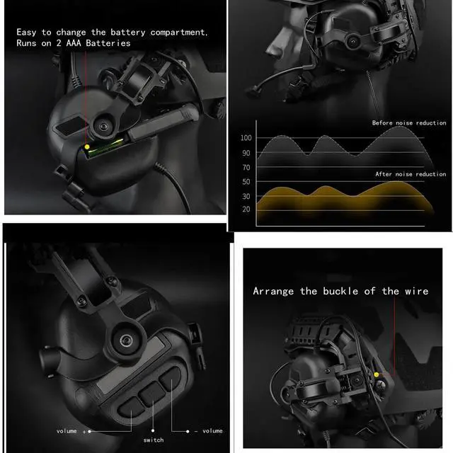 What goods will you get? 1* Tactical Headset, 2*Multifunction ARC Rail Adapterwith install fittings, 1*U94 type headset PTT ^^ What are the functions of this series of tactical headphones? This Version not Only has Communication Function, but also this headset has electronic active noise reduction and sound pickup technology, ( sound collection function / soundproof function / hearing protection function), Runs on 2 AAA Batteries (not included) with waterproof battery cap. ^^ Humanized Design, Conversion of two application modes, The ACR rail adapter is compatible with the full range tactical FAST helmets, ACH helmets, MICH helmets with OPS Core ARC rail on the sidesThe design of the Head hoop, It can also be worn alone on the head ^^