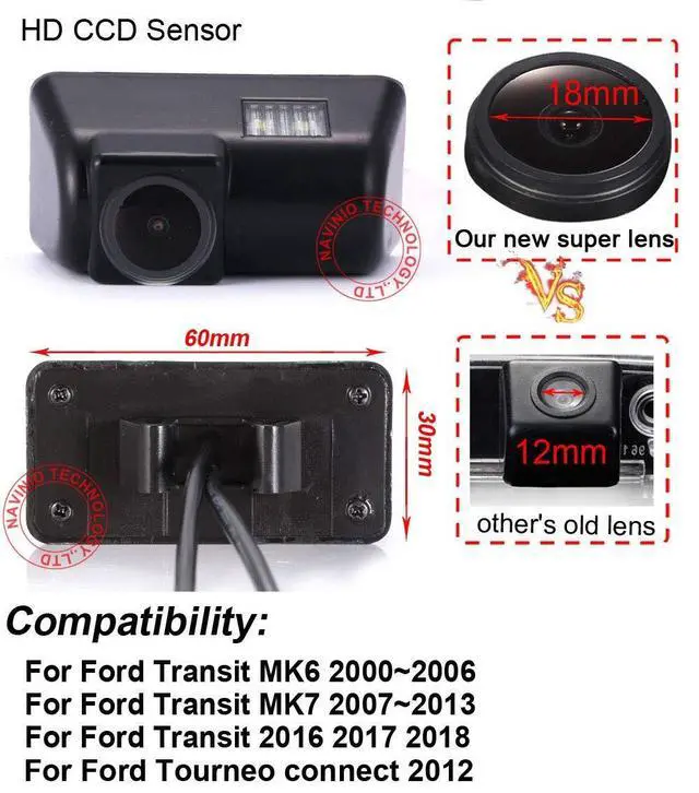 1280 * 720 pixels 1000TV lines. Replacement for Ford Transit MK6 2000-2006; Ford Transit MK7 2007-2013; Ford Transit 2016 2017 2018; Ford Tourneo connect 2012 ^^ Since some cars' navigator comes with the distance line, the camera is without distance guidelines by default to avoid the overlap of redundant distance lines. If you need the distance guide lines, you can cut the white line next to the camera and the guide distance line will appear (as shown). ^^ Our camera has the international waterproof performance of IP68, shockproof and night vision.