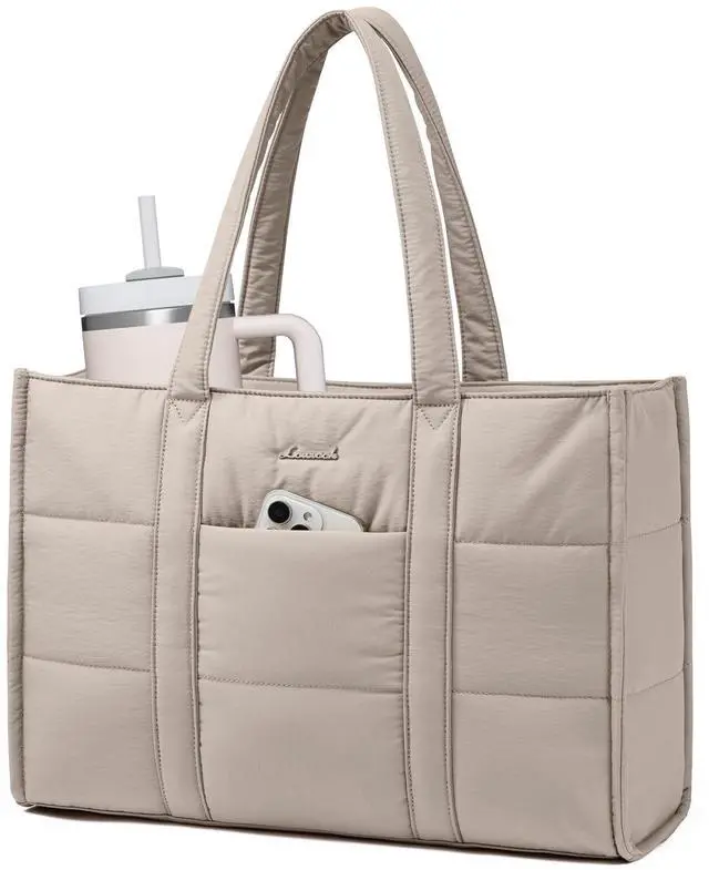 Keeping All Your Items OrganizedThis laptop bag for work has 1 separate padded 15.6 -inch laptop compartment, 1 iPad tablet pouch, 2 pen slots, 2 slip pockets, 2 side pockets, and 1 zipper pocket for your items ^^ Stanley Large Bottle Inner PocketThe interior pocket can keep a 40oz Stanley water bottle or tumbler upright and easy to grab, which is a must-have for commuters ^^ Lightening the Burden on Your Shoulders & HandsWeighing 0.99 LBS, the puffer tote bag is made from padded cotton for lightness, making it great for long time use ^^ Pick Items in a SecondThe front pocket of the quilted bag provides easy access to your phone.