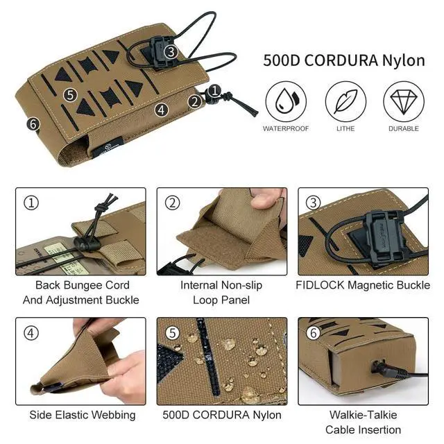 IMPORTED RAW MATERIAL: Tactical Radio Pouch is constructed of 500D cordura fabric imported from the original crye precision from the United States, with the property of durability, water resistant and tear-resistant.