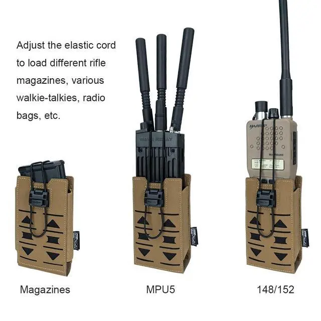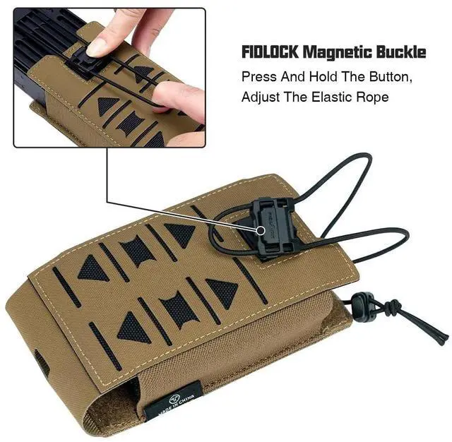 ^^ ADJUSTABLE DESIGN: The bungee cord on the top and a flex-dura UTX buckle can be adjusted according to the size of the loaded walkie-talkie or other equipment such as 5.56 / 7.62 magazines, small water bottles, etc. The FIDLOCK magnetic buckle is very convenient to open and close quickly with one hand. Of course, it can also be used to adjust the tightness of the fixed.