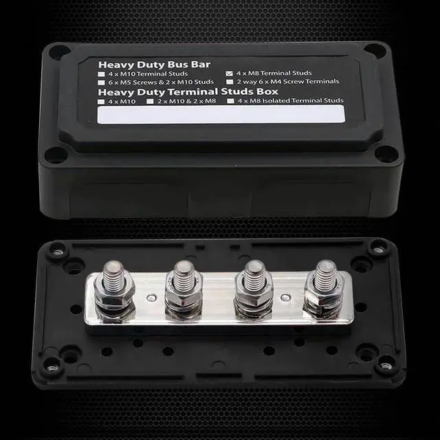 continuous amperage: 200A at DC 12V. 4, With cover, 4 removable side plates for easy wiring. 5, Sturdy Nylon housing, mechanically strong, waterproof, rust-proof, insulated, heat resistant and flame resistant, durable made for safety use. 6, Widely used for car, vehicle, Rv, truck, marine and boat, audio, amplifier, video, solar, also electrical equipment / appliances.