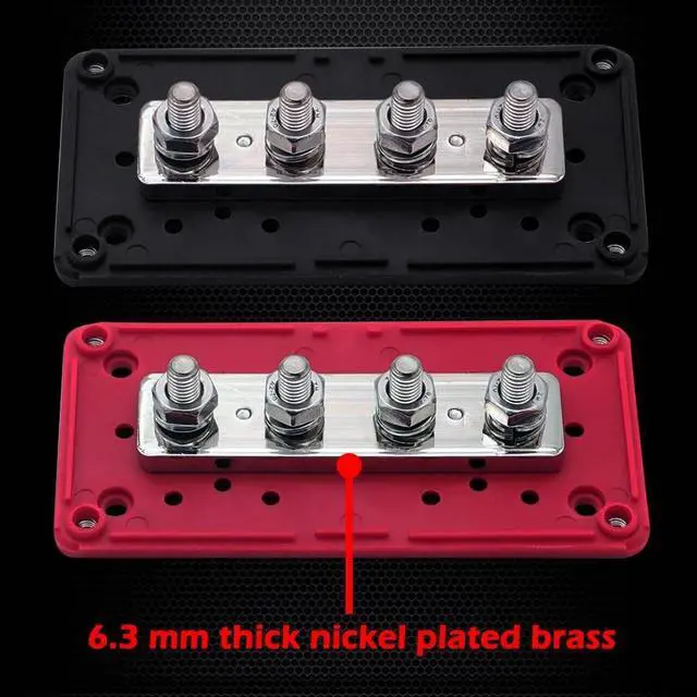 : 1, Solid M8 posts busbar. 2, Thick ( 6.3 mm) nickel plated brass bus bar. 3, Operating voltage 12V - 48V DC / 300V AC, Max