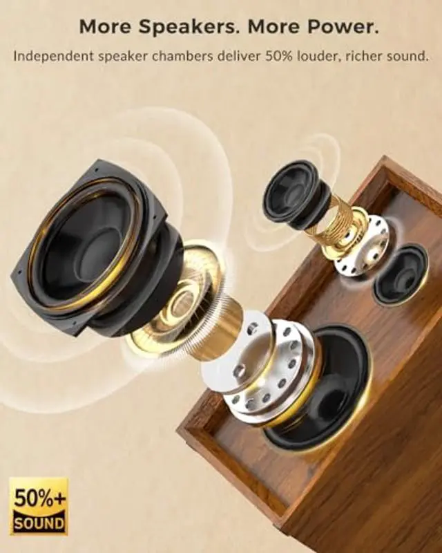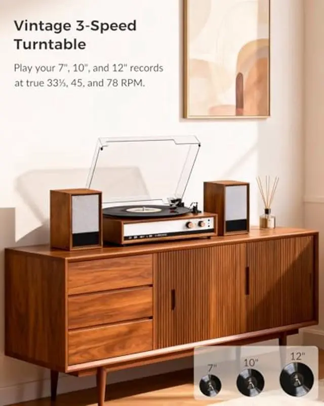 Bigger, Cleaner Stereo Sound Dual external stereo speakers deliver louder, richer sound with clear left-right separationthis vinyl record player fills the room, not just the space around it ^^ Smooth Playback with No Skipping Belt-drive turntable with shock-absorbing platter and vibration-reducing feet ensures stable playback and protects your records from skipping ^^ Plays All Your Records Supports 3 speeds (33/45/78 RPM) and 3 sizes (7/10/12 inch), making this LP player perfect for modern albums, vintage vinyl, and classic singles ^^ Bluetooth Streaming Made Easy Built-in Bluetooth receiver lets you wirelessly play music from your phone or tablet up to 33 ftmodern convenience with classic vinyl sound ^^ Multiple Ways to Listen RCA output for external speakers, plus headphone jack and AUX inputenjoy music your way, whether loud, private, or wired ^^ Designed for Everyday Use & Gifting Auto shut-off saves power, removable acrylic dust cover protects records, and the wood finish makes this turntable a perfect gift for Christmas, birthdays, and special occasions